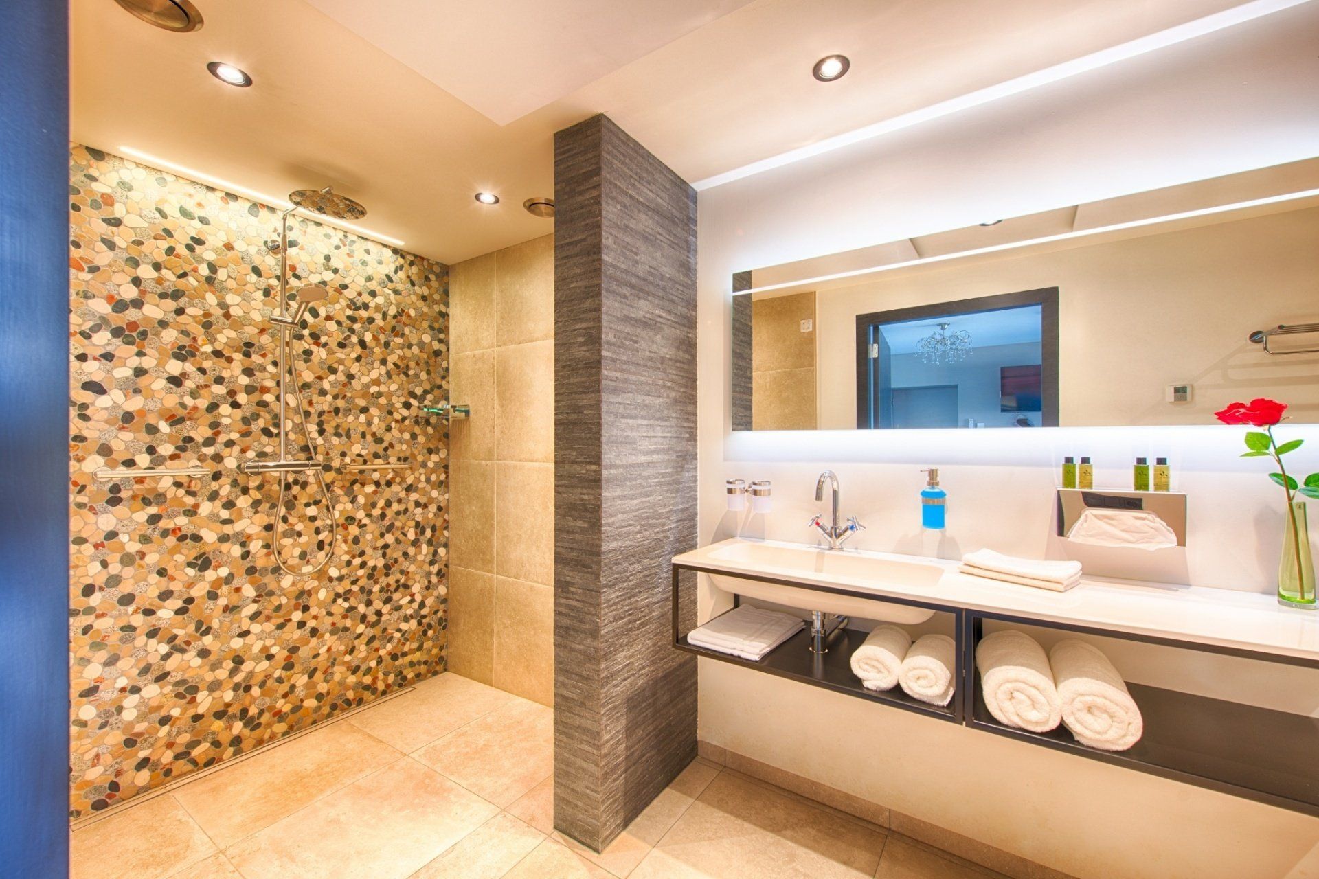 Luxe badkamer met sfeerverlichting, infrarood warmtepanelen, inloop- regendouche, ruime wastafel met föhn en toilet.